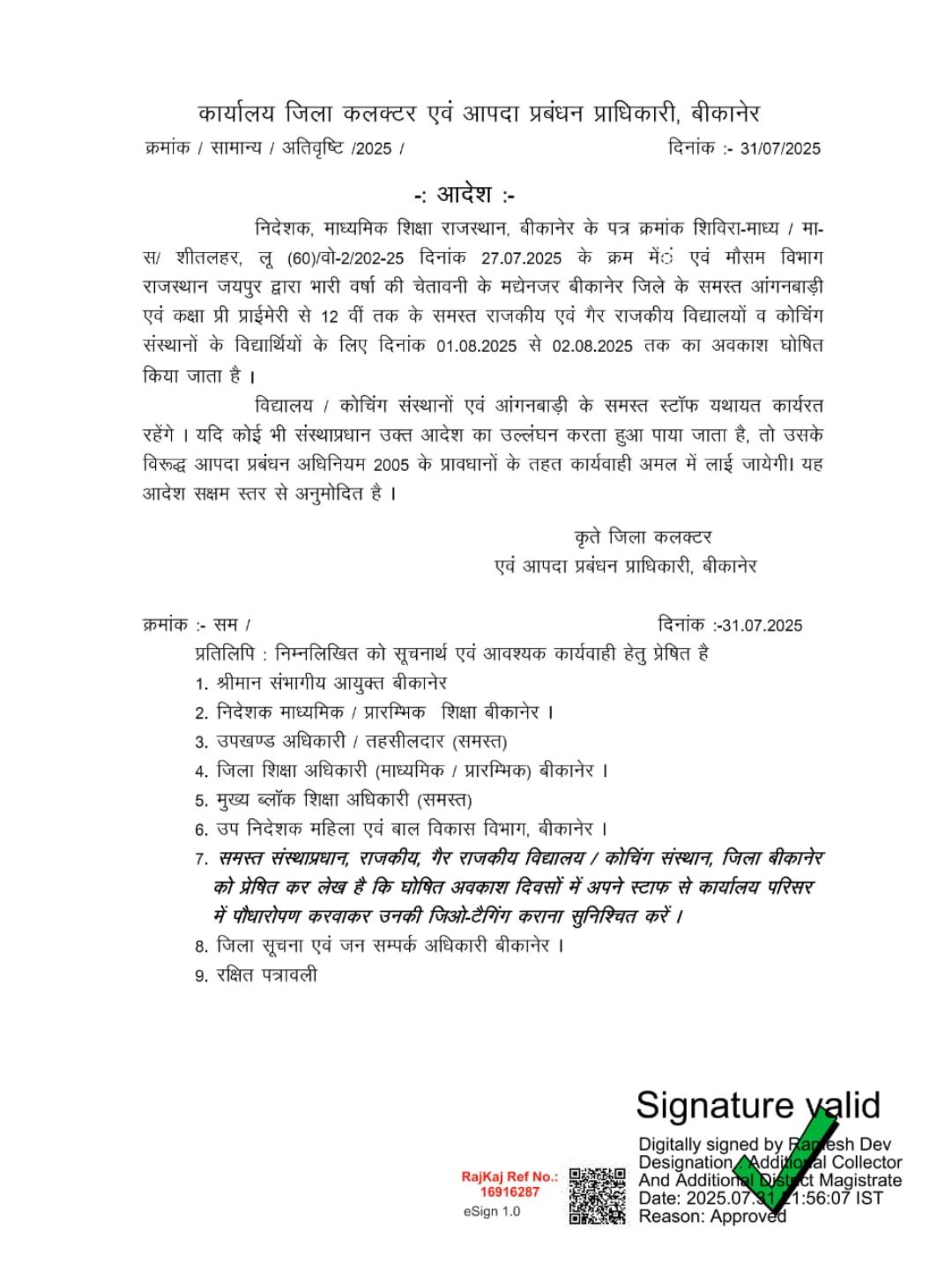 **श्रीडूंगरगढ़, 31 जुलाई 2025:** जिला कलेक्टर कार्यालय से प्राप्त जानकारी के अनुसार, श्रीडूंगरगढ़ में 1 अगस्त 2025 (शुक्रवार) और 2 अगस्त 2025 (शनिवार) को 12वीं कक्षा तक के सभी सरकारी और गैर-सरकारी स्कूलों तथा कोचिंग संस्थानों में अवकाश रहेगा। जिला कलेक्टर कार्यालय द्वारा इस संबंध में आदेश जारी कर दिया गया है।