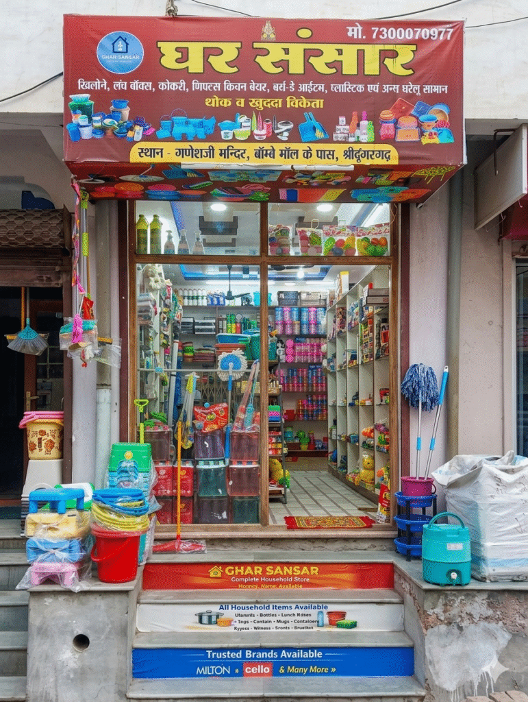 घर संसार स्टोर’ पर घर की जरूरतों का सामान जैसे किचनवेयर, प्लास्टिक आइटम, सफाई के उपकरण (झाड़ू, पोछा, बाल्टी) और अन्य घरेलू सामानों की एक विस्तृत रेंज उपलब्ध है। स्टोर की सबसे बड़ी खासियत इसकी कीमतें हैं, यहाँ सामान की शुरुआती कीमत मात्र ₹9 से है। किफायती दाम और बेहतरीन क्वालिटी के कारण यह स्टोर क्षेत्र में चर्चा का विषय बना हुआ है।