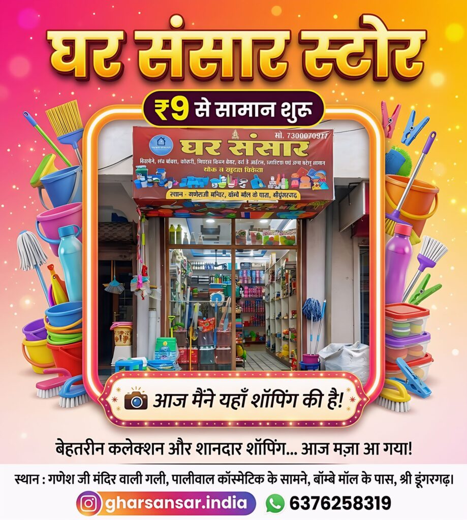 श्री डूंगरगढ़। कस्बे के निवासियों के लिए घरेलू सामान की खरीदारी अब और भी आसान और किफायती होने जा रही है। श्री डूंगरगढ़ के ‘घर संसार स्टोर’ ने ग्राहकों के लिए बेहतरीन कलेक्शन के साथ-साथ शानदार ऑफर्स की बौछार कर दी है।